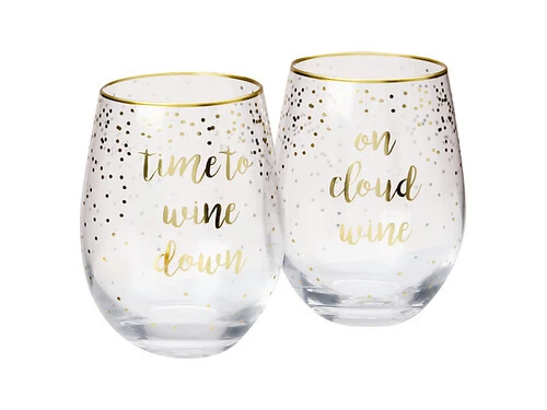 Cheers to the holidays with these witty glassware sets from the Celebrations collection. Each set includes two stemless glasses decorated with festive gold confetti dots and a cheeky saying.